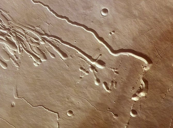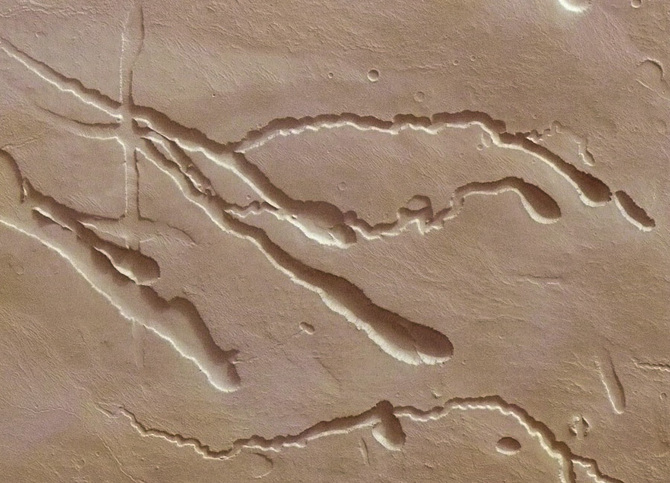 Surface features of lava tubes on Mars; image via ESA