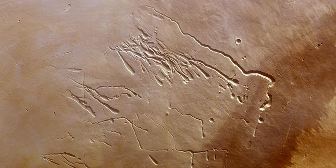 Surface features created by lava tubes on Mars; image via ESA