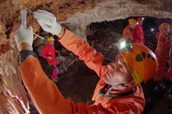 ESA astronauts take microbiological samples during a 2011 training mission in the caves of Sardinia; image courtesy of the ESA.
